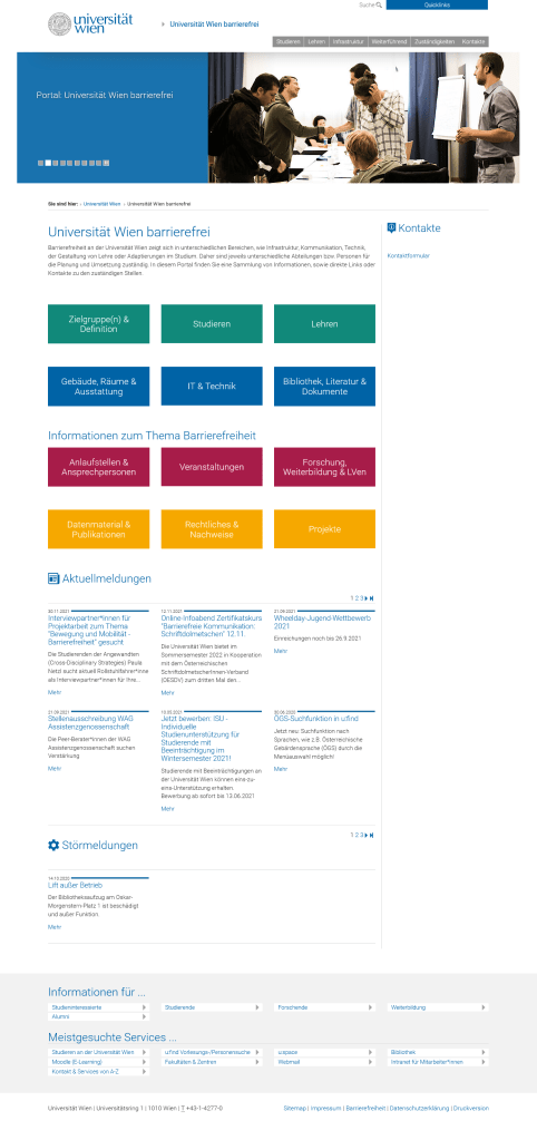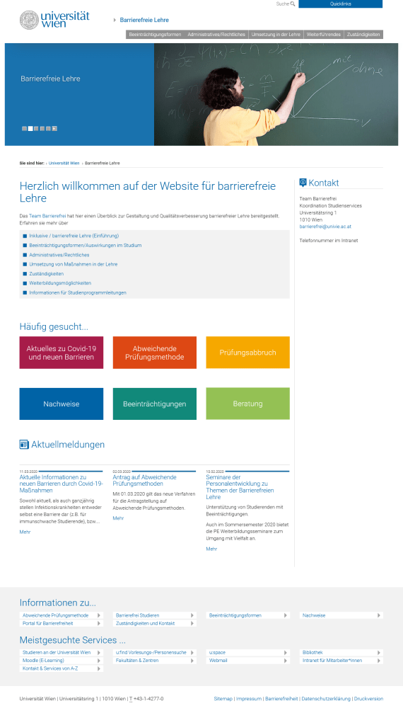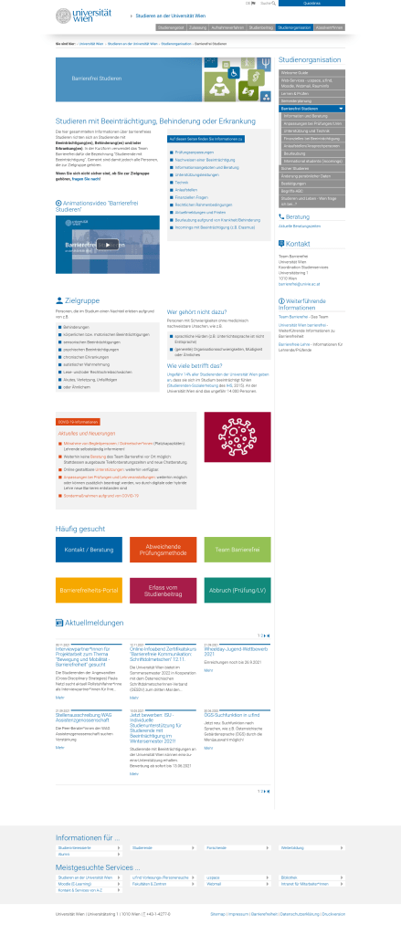 In meiner Arbeit im Team Barrierfrei der Universität Wien gehörte neben meiner Beratungstätigkeit auch das vollständige CMS der Webauftritte. Die UW stellte ihre Online-Präsenz in ein völlig neues Design, weshalb ich damit beauftragt wurde die über 10 Jahre alten Websites rund um barrierefreies Studieren und Lehren zu überarbeiten und ins neue Design zu gießen. Nach einem 3-jährigen Prozess entstanden drei völlig neue Websites, die mit den Auftritten davor nur mehr wenig zu tun hatten.